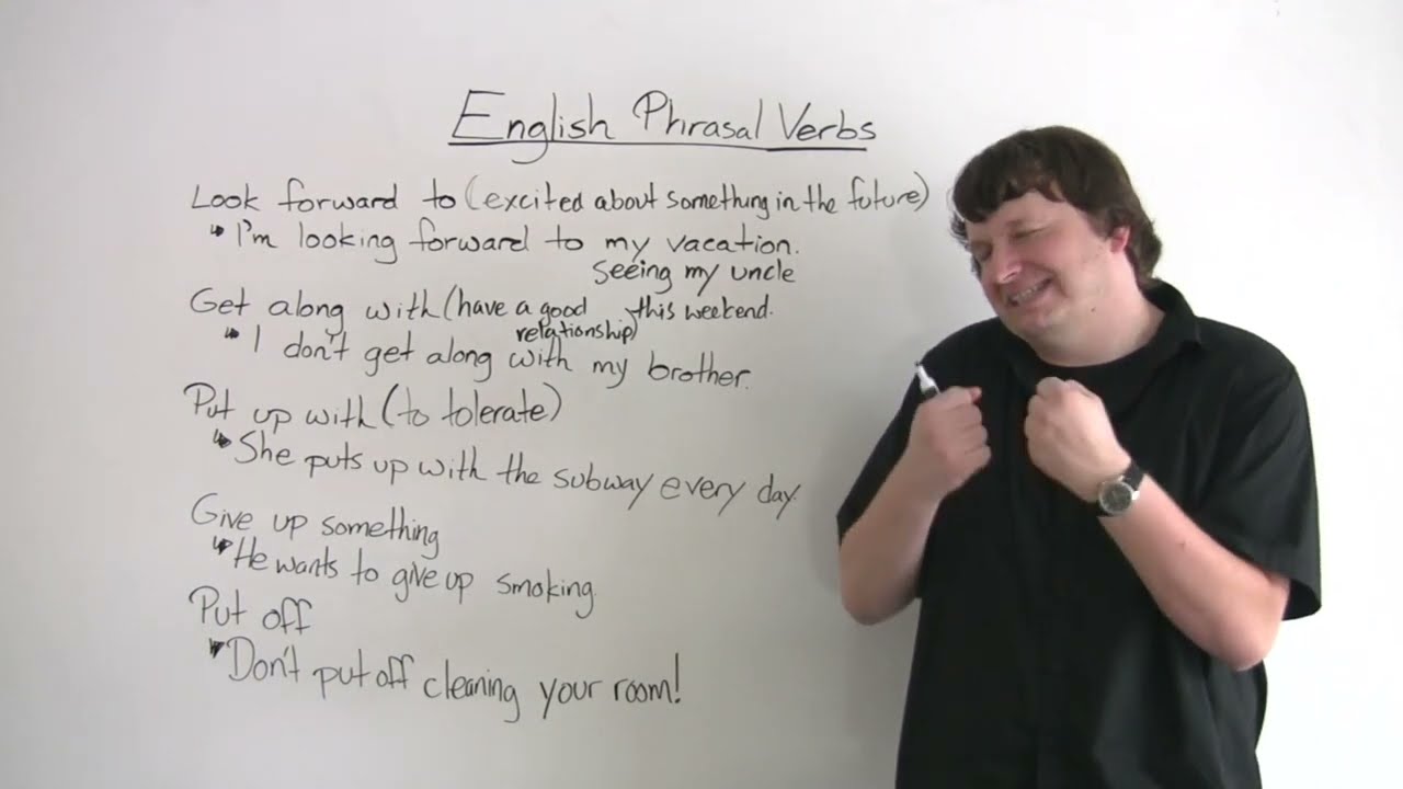 Learn the meanings of 5 important phrasal verbs in this English lesson. I teach the following: look forward to, get along with, put up with, give up something, put off.