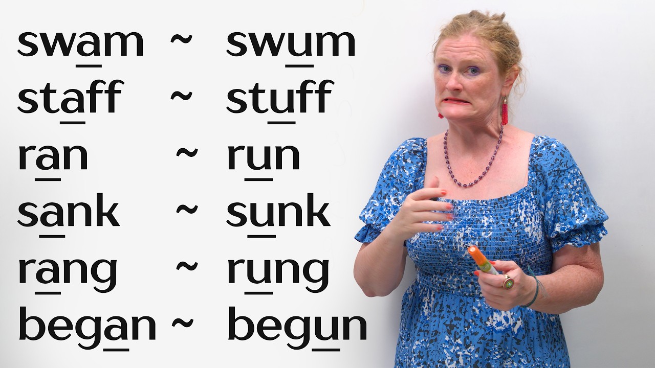 The “ah” and “uh” vowel sounds in English sound similar, but mixing them up can completely change your meaning. I will show you the difference between the “ah” sound and the “uh” sound in English, and how important this small vowel difference can be. We will look at common minimal pairs like swam/swum, sang/sung, ran/run, staff/stuff, and more. I explain how to open your mouth for the “ah” sound (like at the dentist!) and how the “uh” sound comes more from the throat. Listen to me and then practice with me. Let’s fix this vowel problem once and for all.