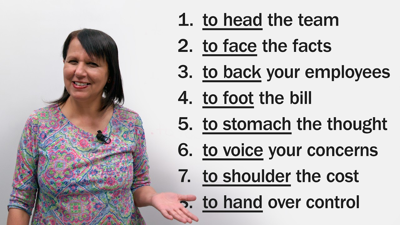 “Head the team?” “Foot the bill?” “Face the situation?” Upgrade your English by using simple words you already know in more advanced ways! Learn how body part nouns become business English verbs in expressions like shoulder the responsibility, back the decision, stomach the thought, hand over control, voice concerns, and more. Watch now and speak more fluent business English today!